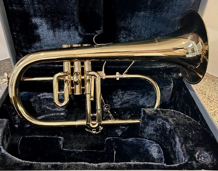 Small 0.413-inch bore and a large 6.6-inch bell produces rich consistent warm sound in all registers, good intonation, mechanics are very good, hand-lapped monel pistons, 3rd valve trigger. Lovingly cared for by former professional – the original owner. Minor superfluous dings, areas of lacquer worn from use, minor dent in bell. Comes with Original hard shell locking case with keys, and Mouthpiece