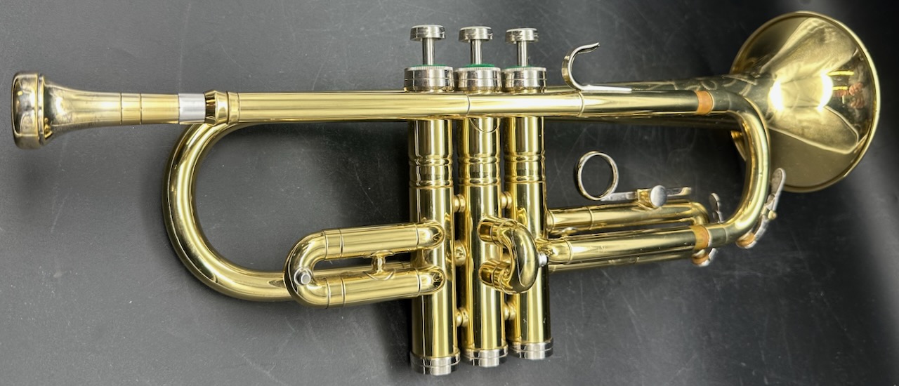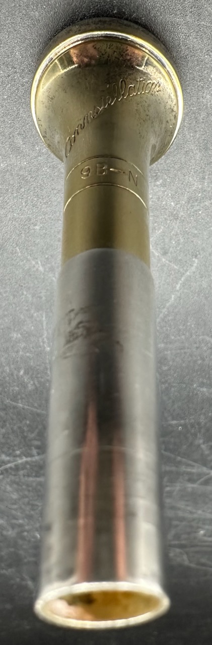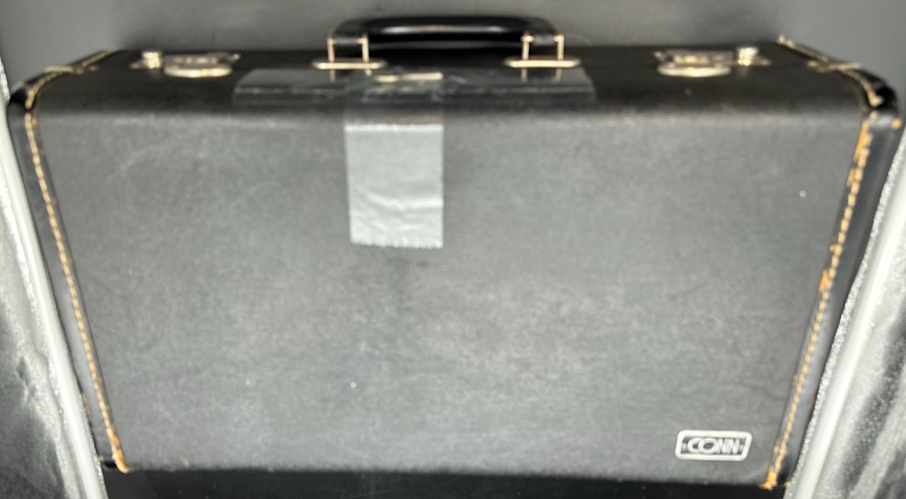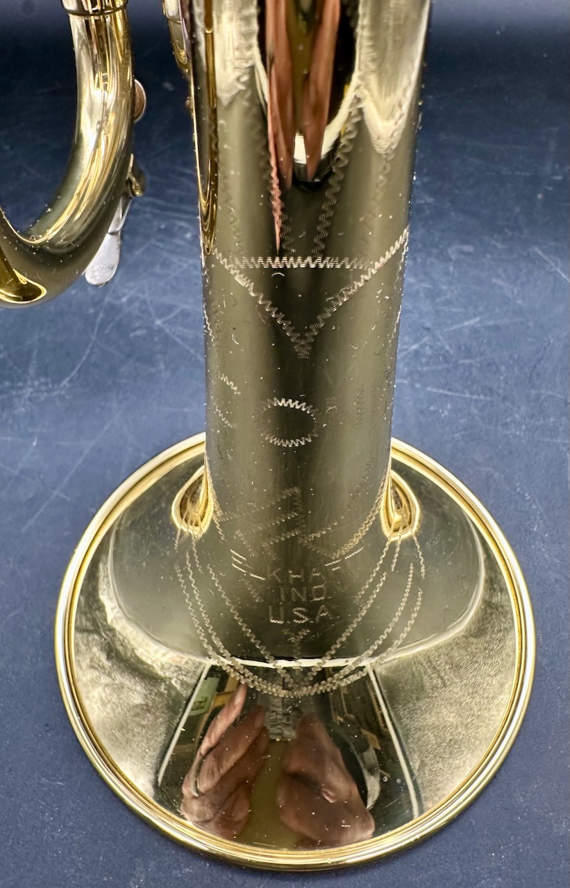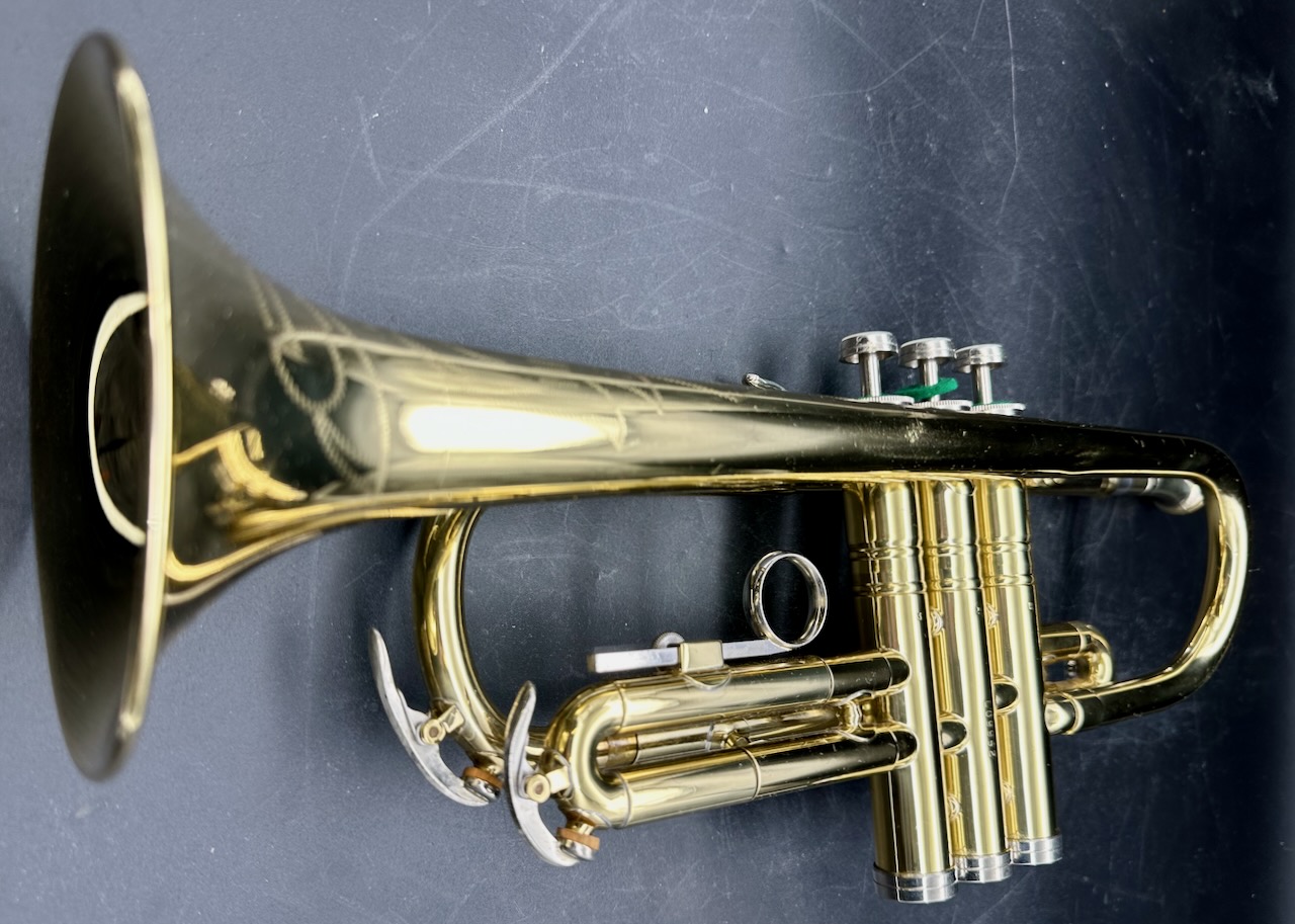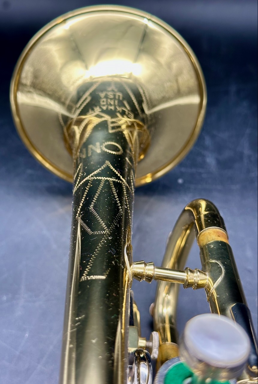 Here is a rare instrument: the 35B Victor D trumpet. Produced between 1961 and 1969 on special order only. It has a #½ bore, which is 0.425″ and bottom spring valves. Interestingly, like the 25B Victor C trumpet Conn chose to base the design of this instrument on the 1955-1957 Victor and not the Connstellation. Perhaps this is telling. Afterall, this is a professional-only instrument, amateurs and high school bands usually don’t require a D trumpet, making the choice of design noteworthy. Please see Comparative quality of Conn instruments, part 2 for a longer discussion of this. Also notice that this instrument doesn’t have any nickel trim, and the 2nd slide is at a right angle to the valve casing in stead of being angled towards the player as is usually the case for instruments in the 1950’s and 1960’s. It also seems to me that when one were to compare the 25B Victor C trumpet, this 35 Victor D trumpet and the 2A Victor (!) Eb cornet, you would see the same design in all of these instruments. Small dent on the bell, I’m hoping to have it repaired before it’s sold. Comes with the original case and a original constellation 9B-N mouthpiece in a combination of gold, silver plate.
