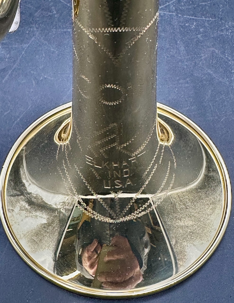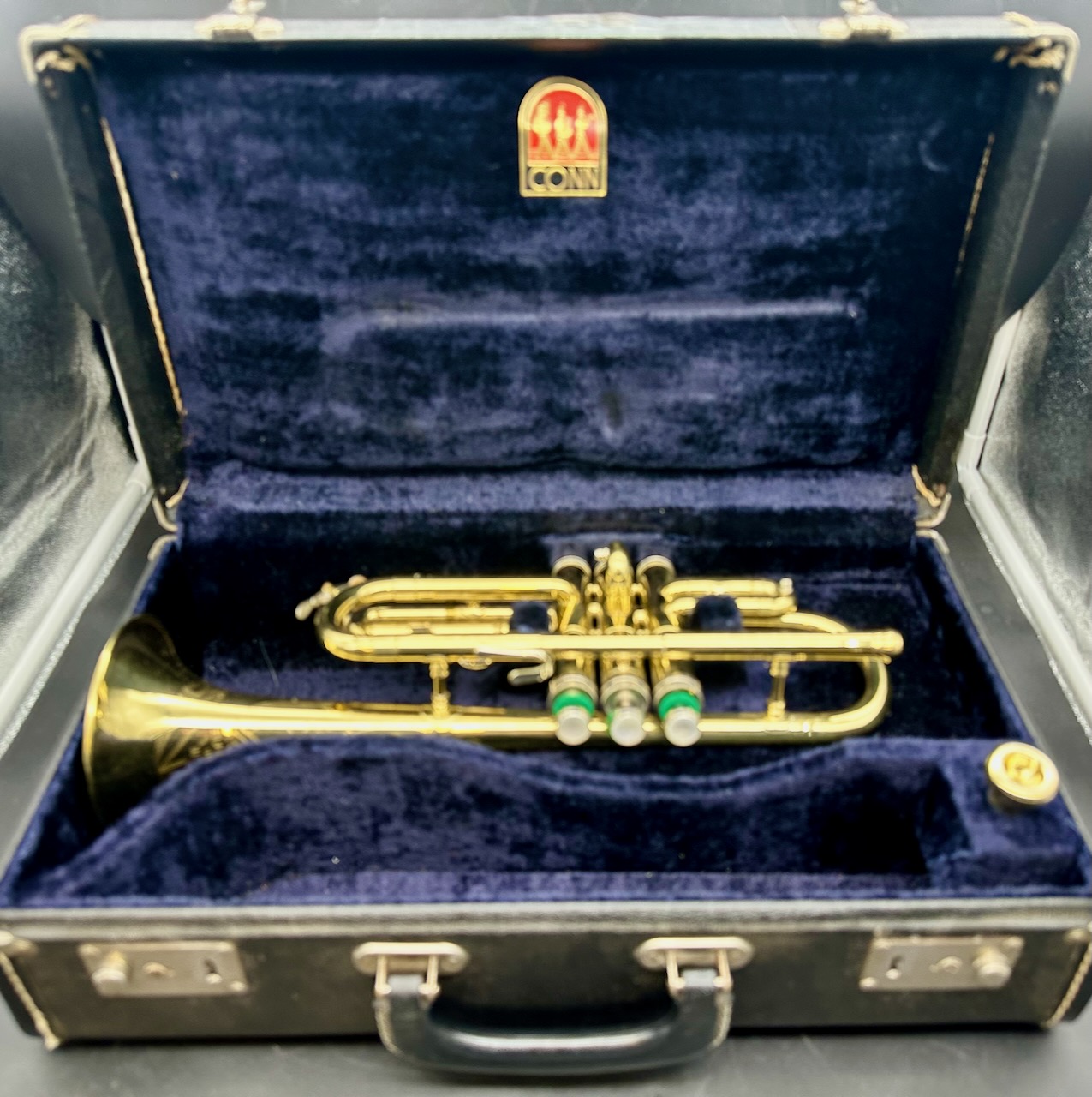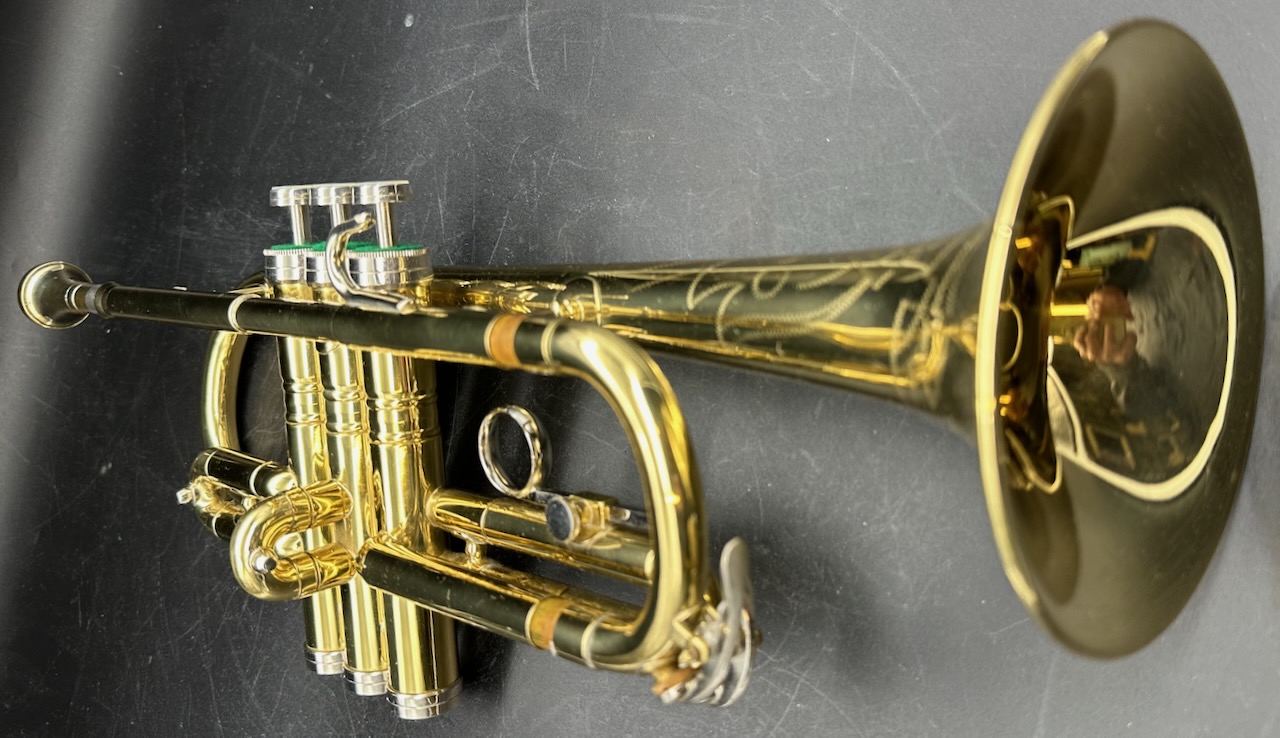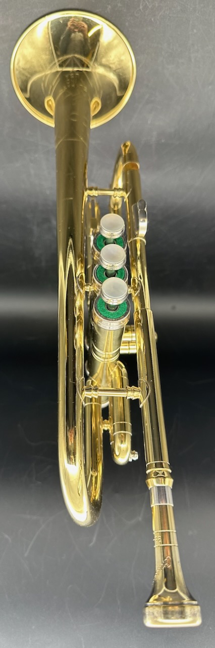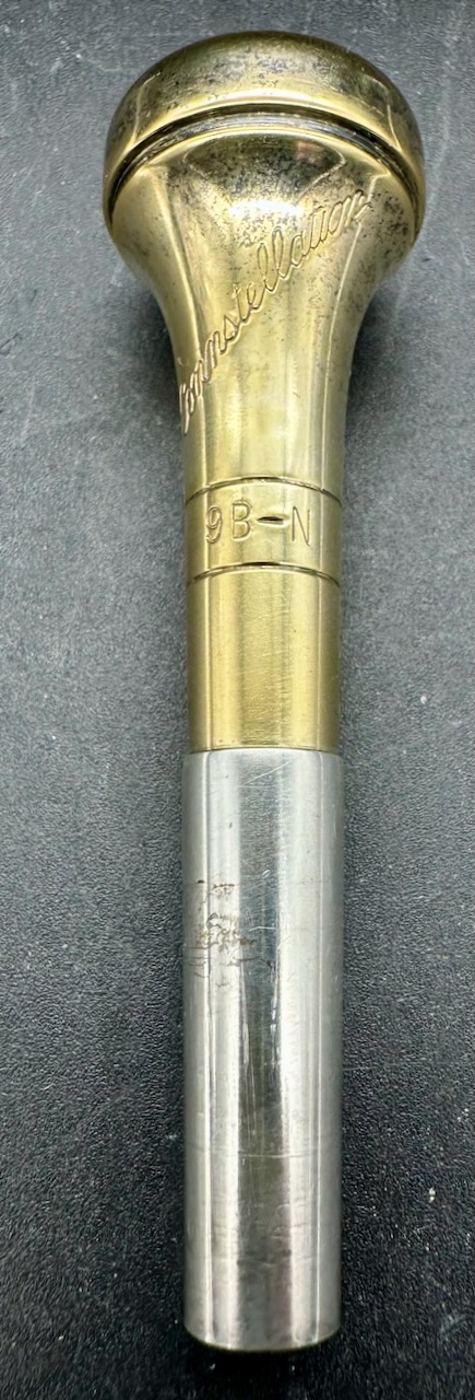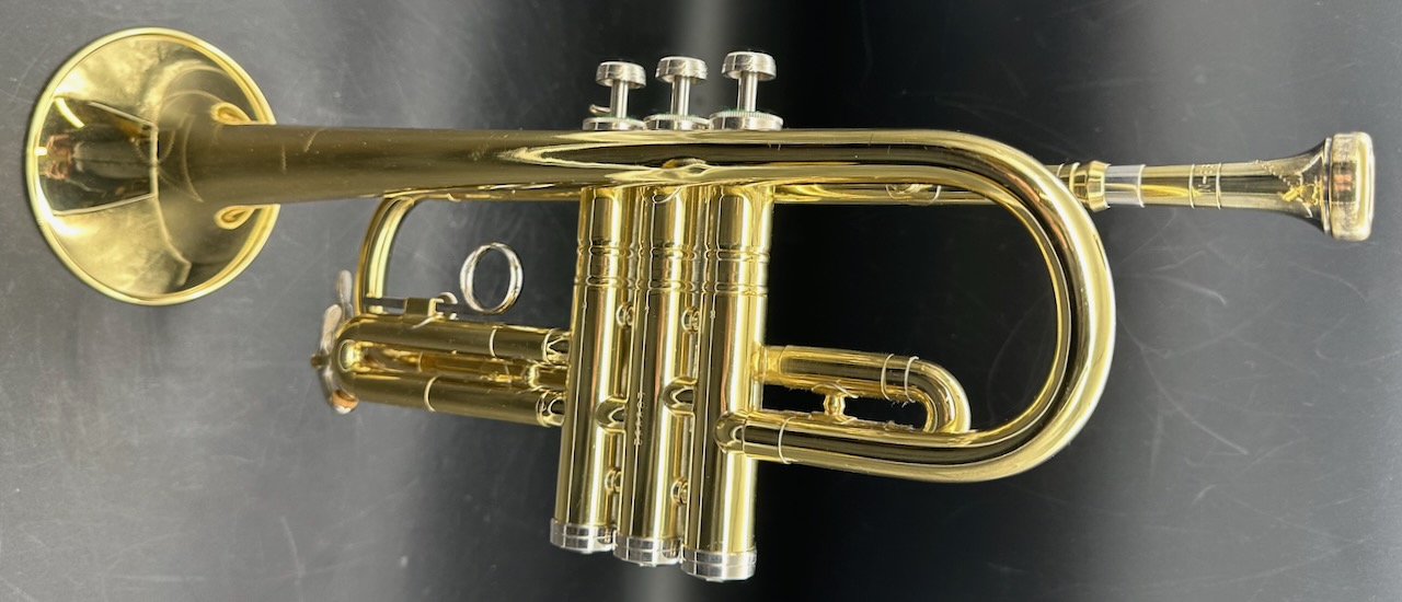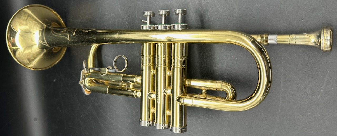 Here is a rare instrument: the 35B Victor D trumpet. Produced between 1961 and 1969 on special order only. It has a #½ bore, which is 0.425″ and bottom spring valves. Interestingly, like the 25B Victor C trumpet Conn chose to base the design of this instrument on the 1955-1957 Victor and not the Connstellation. Perhaps this is telling. Afterall, this is a professional-only instrument, amateurs and high school bands usually don’t require a D trumpet, making the choice of design noteworthy. Please see Comparative quality of Conn instruments, part 2 for a longer discussion of this. Also notice that this instrument doesn’t have any nickel trim, and the 2nd slide is at a right angle to the valve casing in stead of being angled towards the player as is usually the case for instruments in the 1950’s and 1960’s. It also seems to me that when one were to compare the 25B Victor C trumpet, this 35 Victor D trumpet and the 2A Victor (!) Eb cornet, you would see the same design in all of these instruments. Small dent on the bell, I’m hoping to have it repaired before it’s sold. Comes with the original case and a original constellation 9B-N mouthpiece in a combination of gold, silver plate.