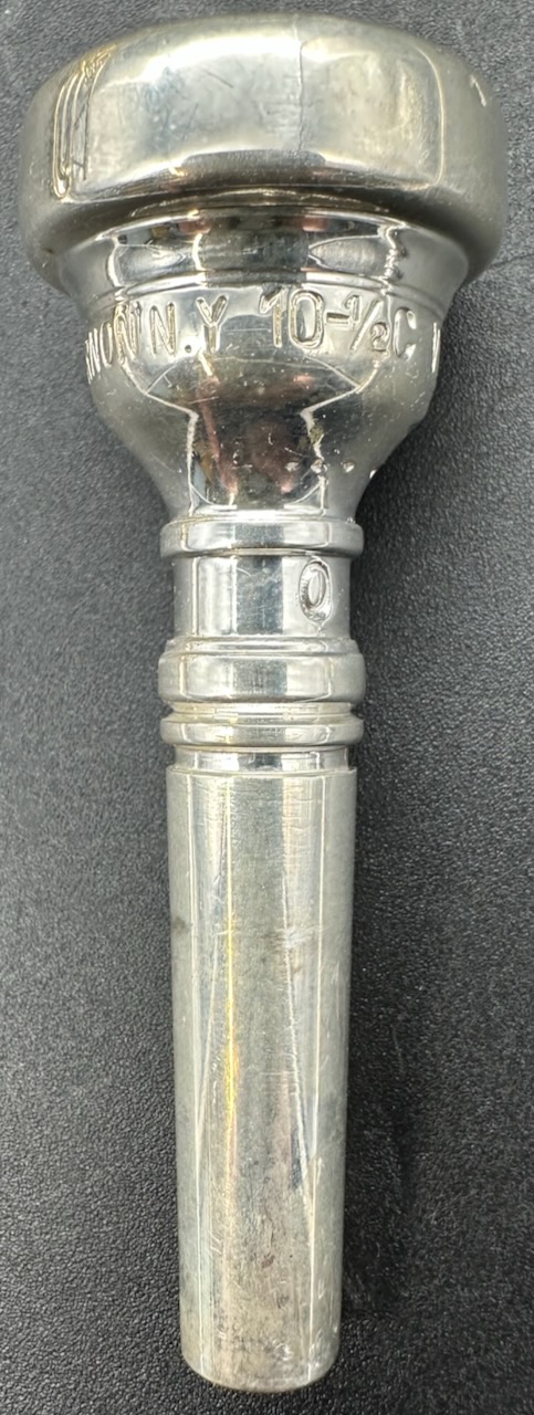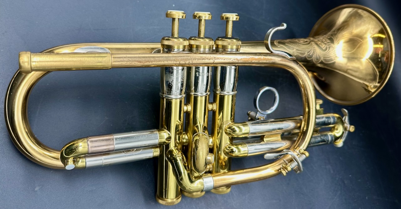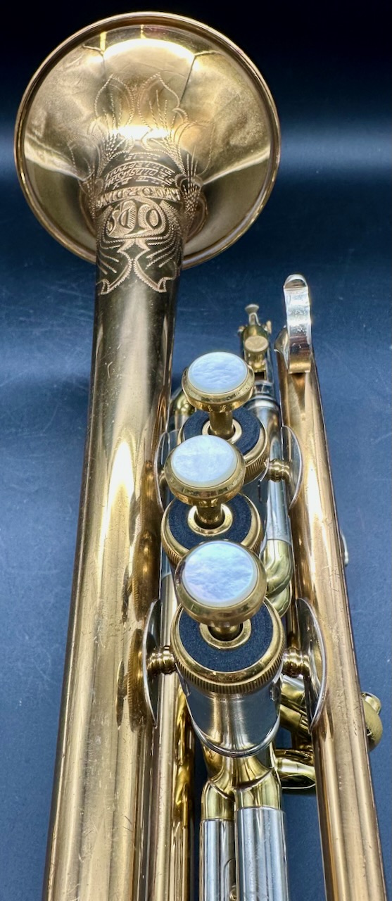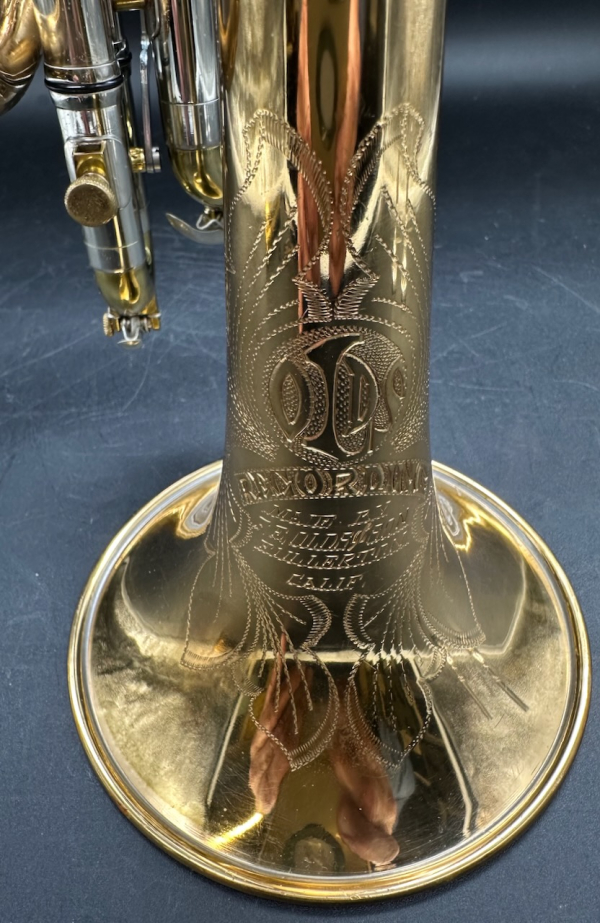 The Olds Recording Trumpet and Cornet were the most radical departure from traditional trumpet design there ever was. It first appeared in the mid 1930’s as a sub-line of the Olds professional line of trumpets, the Super. It was called the Super Recording. It’s concept was to be an instrument designed for ‘recording with prominent motion picture studio orchestras’; who were required to spend many hours in the studio, and needed an instrument that was more comfortable to hold and play for long periods of time. Olds consulted the studio trumpeter Harold ‘Pappy’ Mitchell to discover what features of the trumpet needed to be made more comfortable. First, they balanced the valve section between the bell and the mouthpiece to make it seem lighter; and to be easier to hold and operate. In addition, it allows the player more freedom of movement in the right hand to facilitate operation of the valves. The most notable and unique feature of the Olds Recording is the recessed middle valve, ergonomically placed to compensate for the long middle finger. Around 1949 the word Super was dropped, and it was called simply the Olds Recording. One prominent feature was removed; the exclusive engraved Olds tone control band attached to the bell. Thereafter, all of the bells were hand engraved by Leonard Garcia. Another new feature was also added to the Recording; the third valve slide trigger; to ease control of intonation. Besides the design features that make the Recording a pleasure and comfort to play, there is the physical appearance of the instrument. Every detail was considered to make it as beautiful as it is functional. The high copper content (called ‘Re-O-loy’ by Olds) in the bell and lead pipe sections give the horn a warm, rich and powerful tone; the yellow brass used for the valve section and tuning slide crooks make the instrument very sturdy, and the nickel plating on all the fittings and braces give this instrument a unique tri-tone color effect by offsetting the copper red, yellow brass, and polished silver. Every line and angle was carefully weighed for aesthetic value as well as function, and neither one were ever compromised. Text courtesy of Alan Rouse’s Olds Central website.