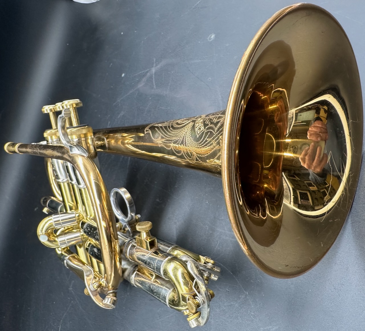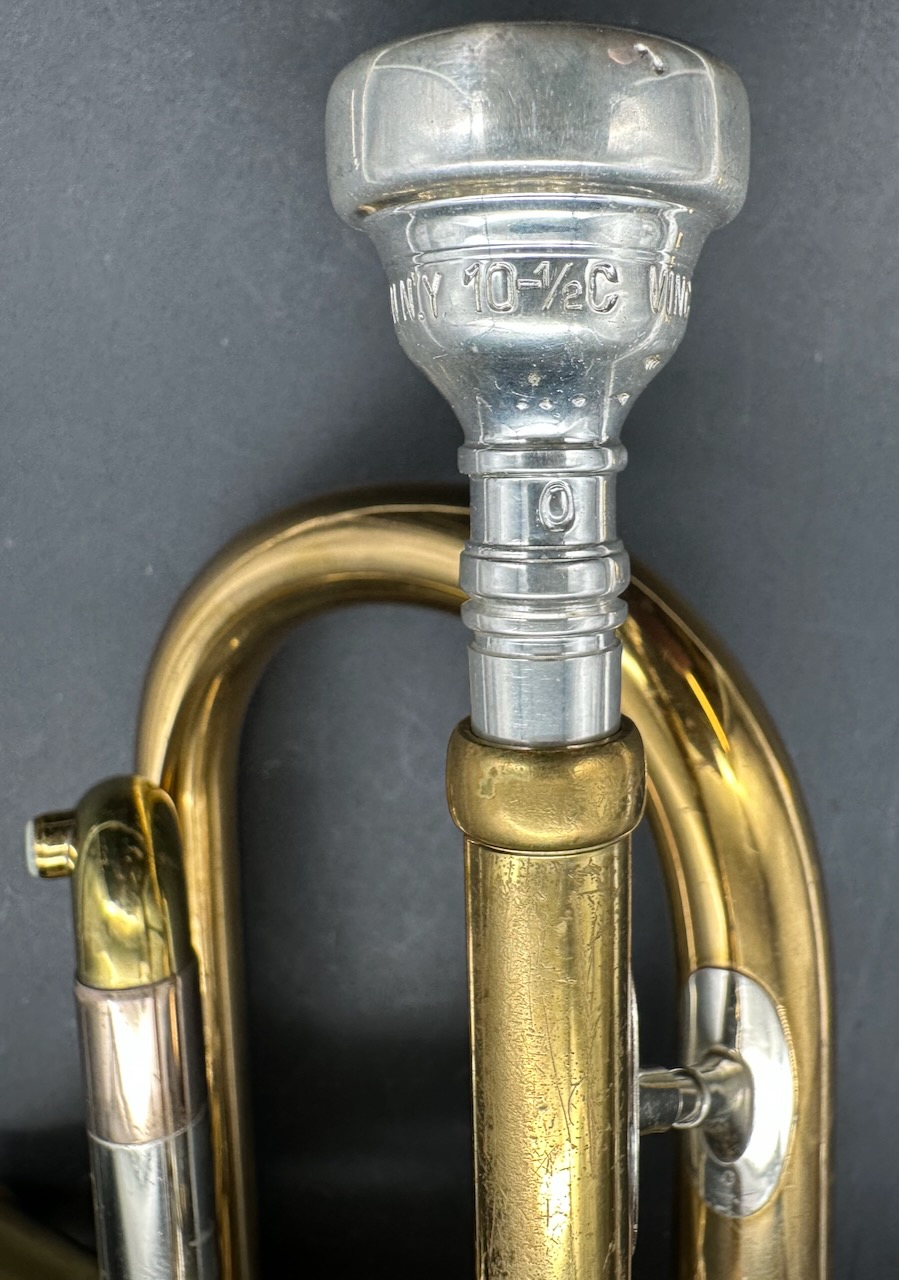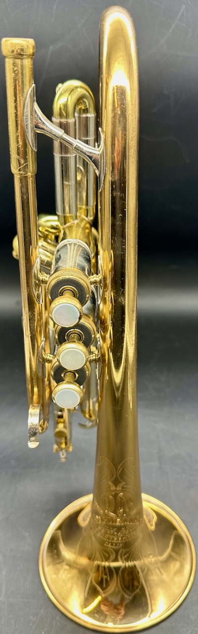 smooth. This one plays like melted butter! Balanced action with the offset valves. Very Cool Olds Recording. Dark tone but can honk if you put the jets to it. The horn is all original including the 3rd slide trigger mechanism. No dents, dings, or trauma. The tone is beautiful dark and rich with spot on intonation. The Bell engraving is sharp and clear and a beautiful example of hand craftsmanship of a by-gone era by Leonard Garcia. Large Bore (.468) Free blowing. Thsis is probably from the 1st year they were introduced. Comes with Bach Mt Vernon 10 1/2 C MPC and a new Protec top loading cornet case.