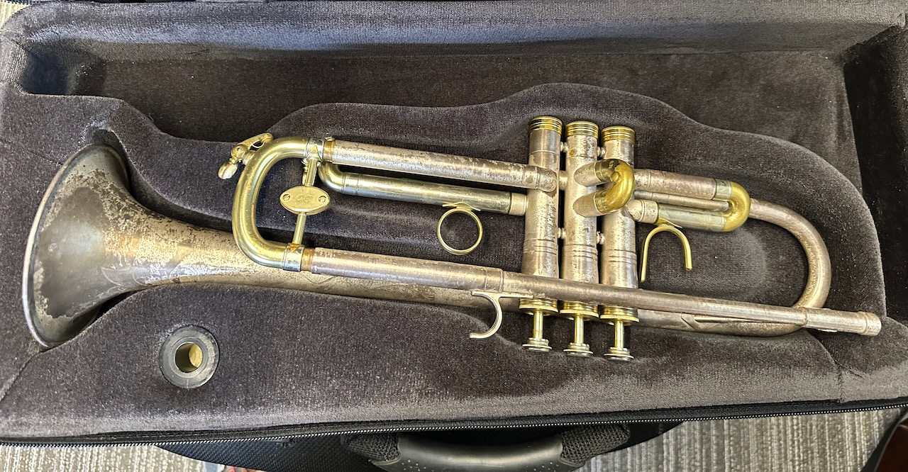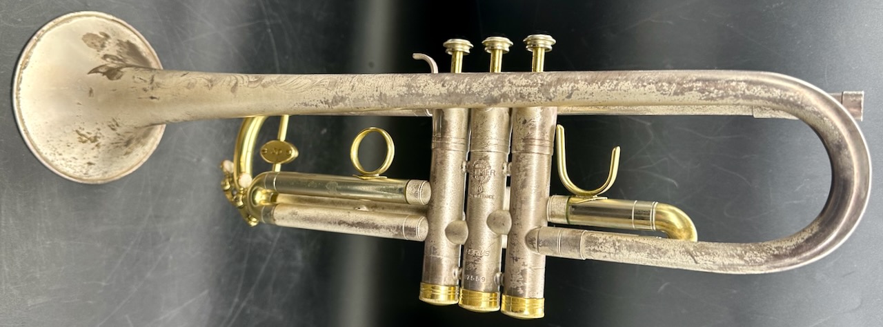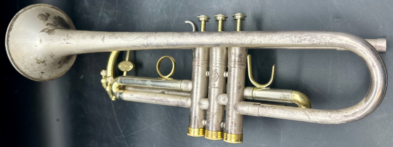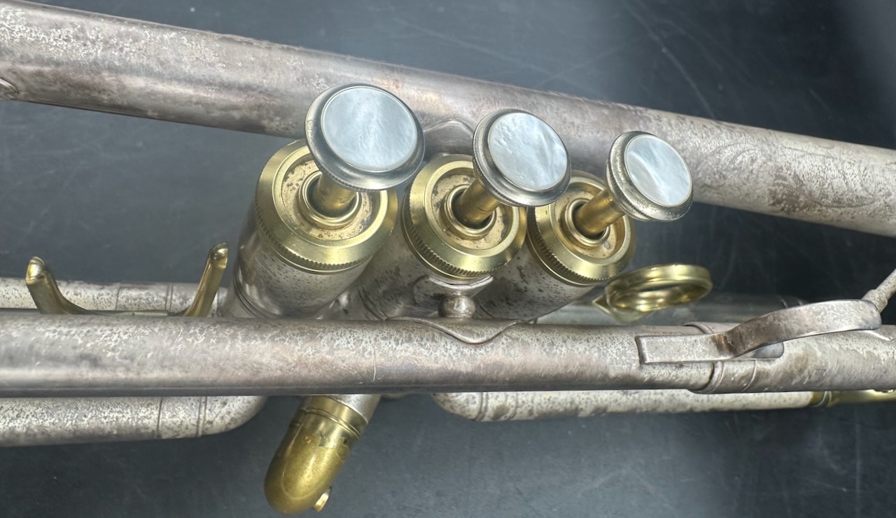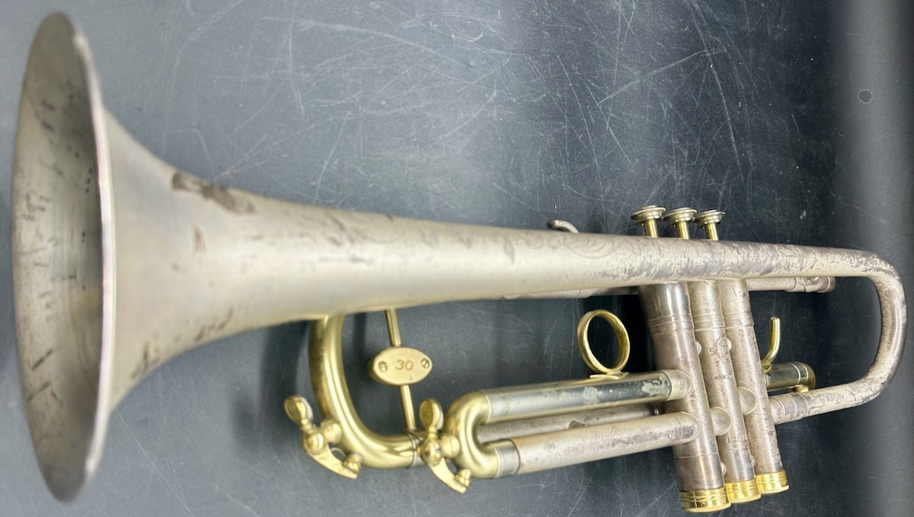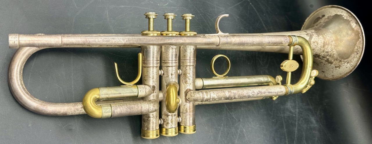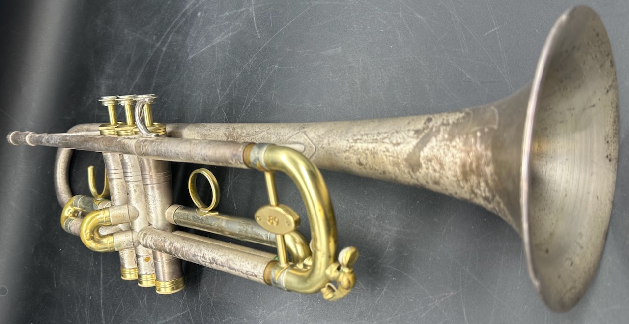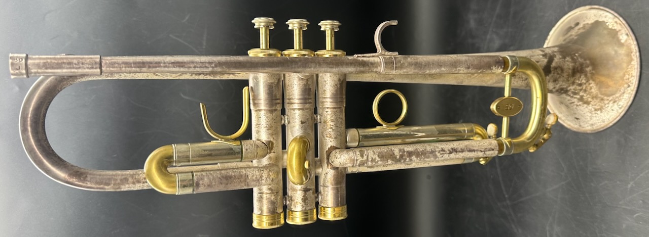 OMG!!!!!! Silver Matte Finish with Engraving. Now the bad news………………. What ever lacquer that was on the horn originally is gone. What you see now is the patina of what was an incredibly beautiful horn.